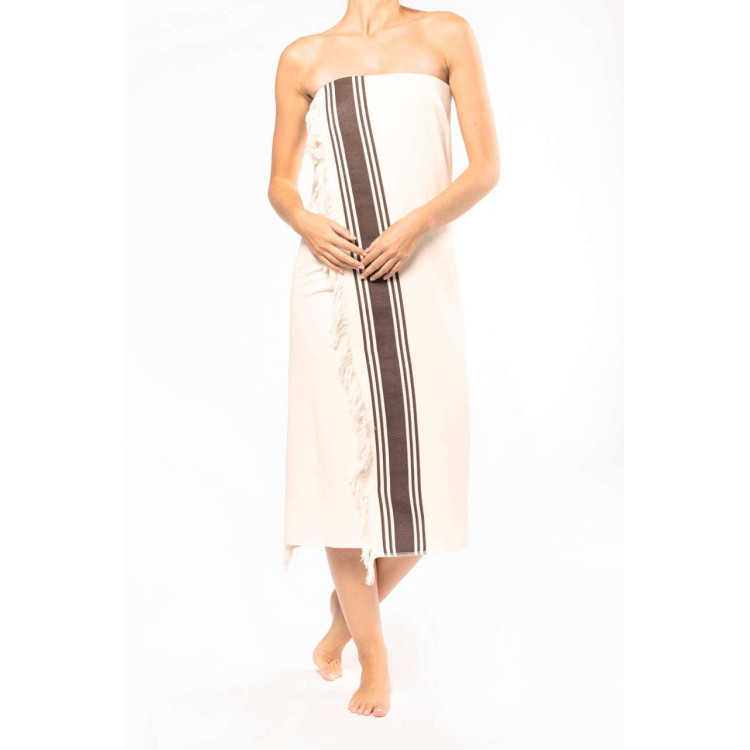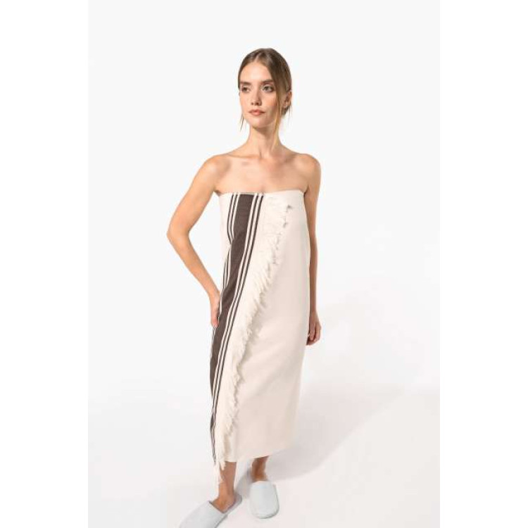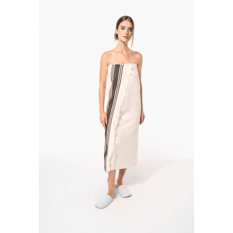100-% bombaž Mere: 180 cm x 100 cm Ena stran je tkana, druga frotirna Kontrastni rob z resicami Certifikat STANDARD 100 OEKO-TEX®N° CQ1007/6, IFTH