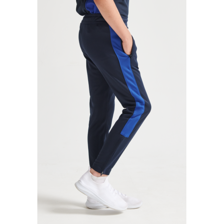 100-% poliester Interlock Ozke hlačnice Kontrastne barvne na stranskih delih Stranski žepi z zadrgo Elastičen pas z notranjo vrvico Zadrge na gležnjih z varovali za zadrge in delno samodejnimi zapenjači