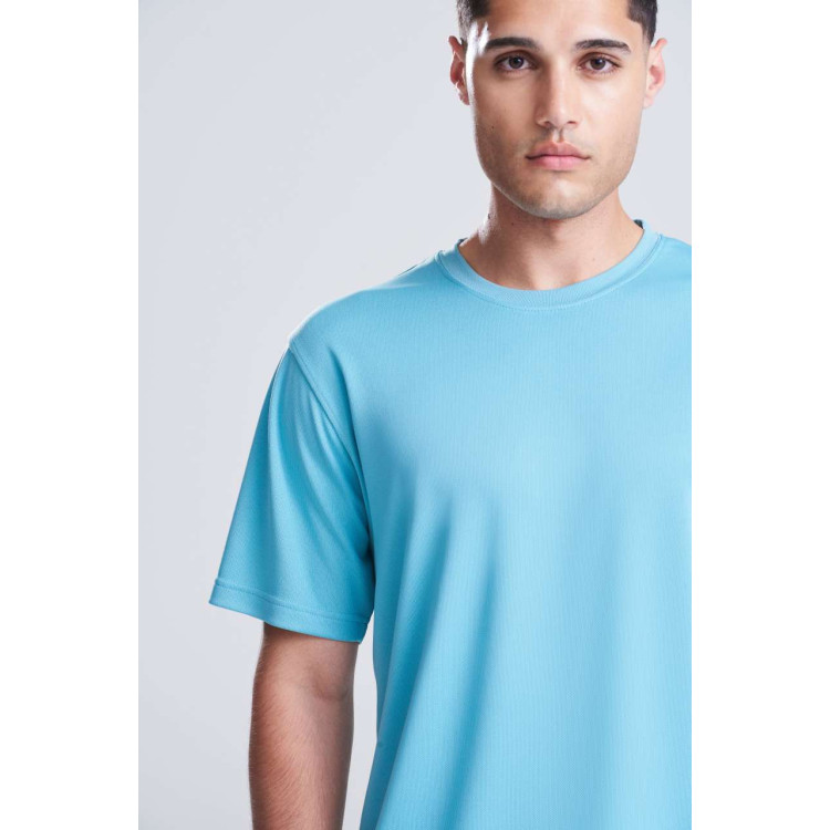 100-% poliester Sproščen kroj Lahka teksturirana tkanina Neoteric TM podjetja AWDis, z značilnimi lastnostmi odvajanja vlage in hitrega sušenja Etiketa, ki se lahko odtrga Okrogli ovratnik iz enakega blaga Detajl z dvojnim šivom Okrepljen zadnji del ovratnika iz enakega blaga UV-zaščita UPF 30+ Raztegljiva tkanina Dizajn z vstavljenimi rokavi