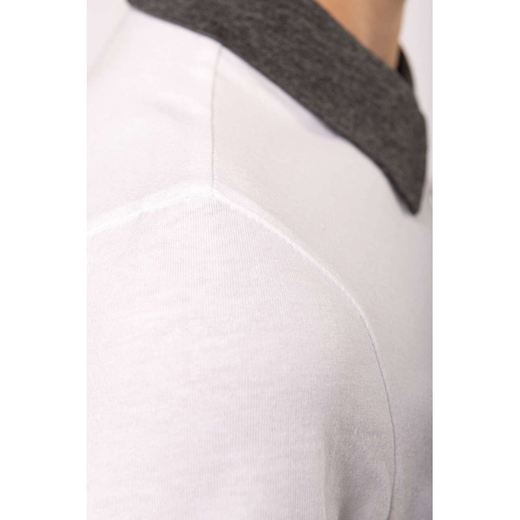 Kontrastni ovratnik in notranje zapenjanje s petimi belimi nepravimi bisernimi gumbi