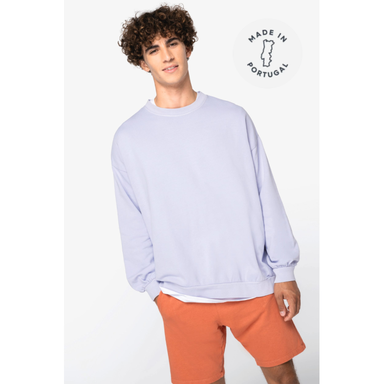 100-% organski bombaž Izdelano na Portugalskem 100-% čeesani bombaž z vijačnim predenjem Prevelik kroj s spuščenimi rameni in napihnjenimi rokavi Francoski frotirni flis Polkrog na hrbtni strani Pokrivni šiv na izrezu, rokavih, manšetah in spodnjem robu 1 x 1 rebraste manšete in spodnji rob Znotraj okrepljen ovratnik z ribjo kostjo Oblačilo je po sešitju pobarvano kot celota: barve se lahko nekoliko razlikujejo Barva se lahko ob stiku s svetlobnimi površinami zbriše.