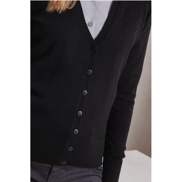 Tkanina 100-% akril Pletenina debeline 12 Značilnosti Rebrast ovratnik rob in manšete Sodoben stil z V-izrezom Fino pleteno Gumbi enake barve Enostavna nega