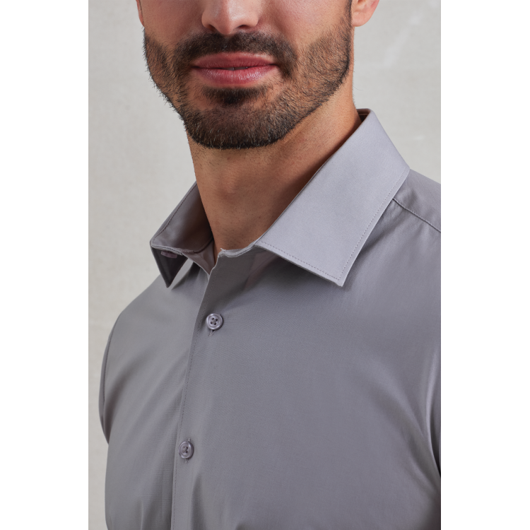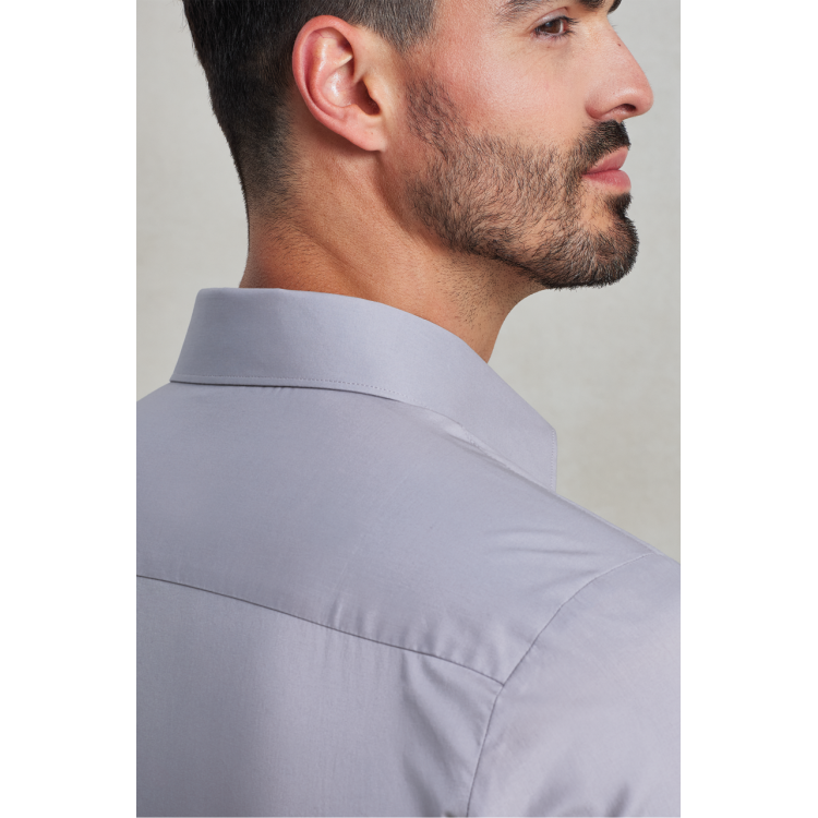 Tkanina 97-% bombaž, 3-% elastanski poplin 115 g/m2 Značilnosti Na razporku za brezhiben videz Ovratnik, ki se ga da odrezati Spuščen rob Mehak občutek in raztegljiva tkanina Moderen kroj