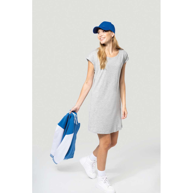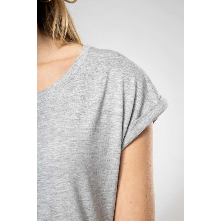 Široko izrezan okrepljeni ovratnik in zavihan rob na rokavih