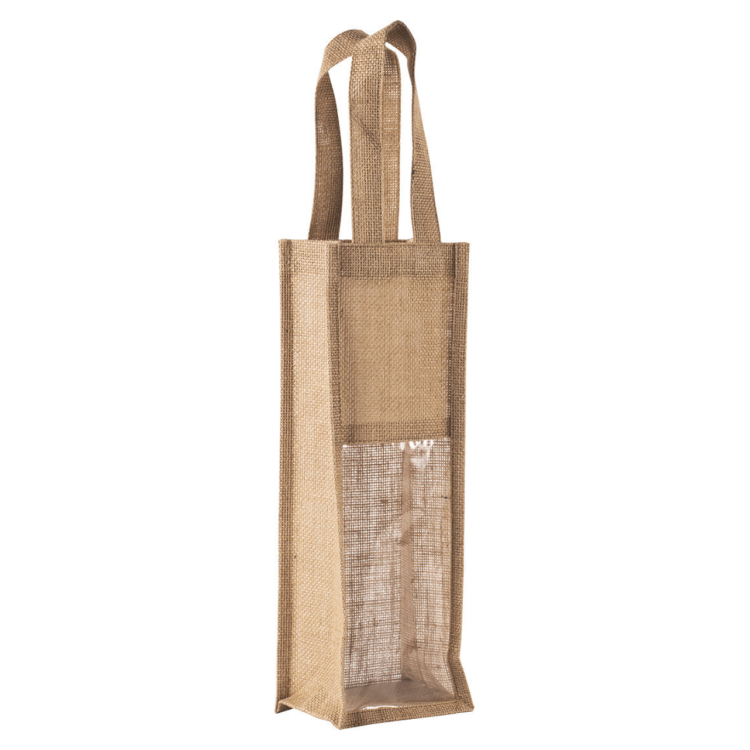 Vrečka za steklenice iz jute, z dvema ročajema in transparentnim okencem na sprednji strani Oblikovana za 1 steklenico