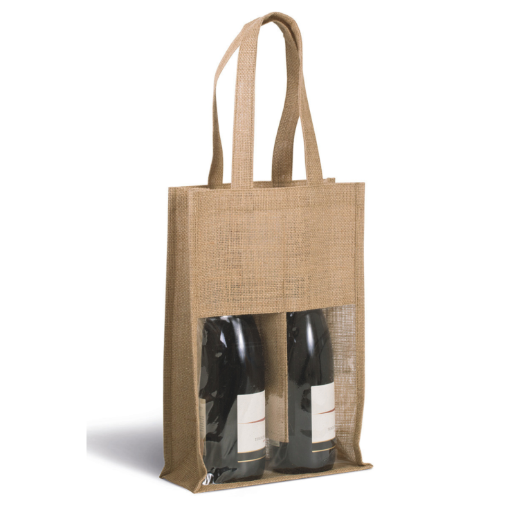 Vrečka za steklenice iz jute, z dvema ročajema in transparentnim okencem na sprednji strani Oblikovana za 2 steklenici