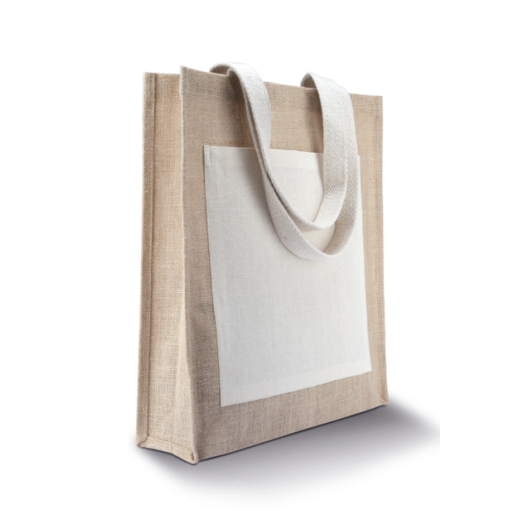 Nakupovalna torba iz jute z bombažnimi ročaji, sprednji bombažni žep Naravna barva: Certifikat STANDARD 100 OEKO-TEX® N° CQ 1164/1, IFTH