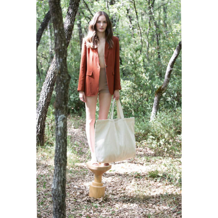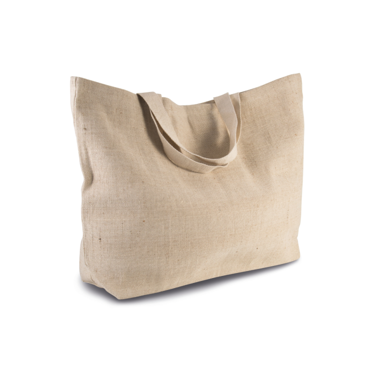 Velika torba iz jutastega platna in bombaža (juco) z vložkom in 55 cm dolgimi kontrastnimi ročaji Preja Juco daje torbici »rustikalen« videz.