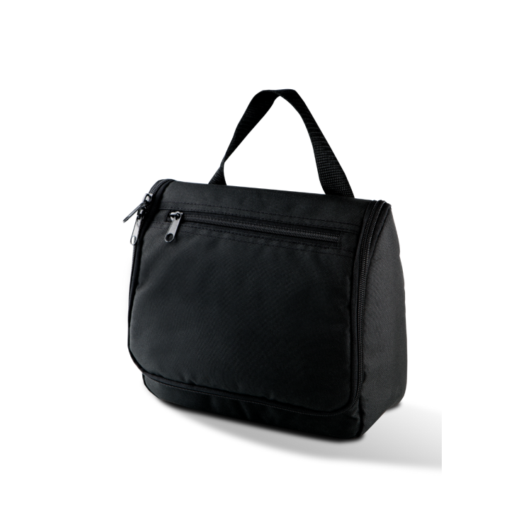 Toaletna torbica iz poliestra 600D, izdelana iz recikliranega poliestra Odpiranje sprednjega zavihka z zadrgo Notranji mrežasti žep Mrežasta držala Kljukast obešalnik